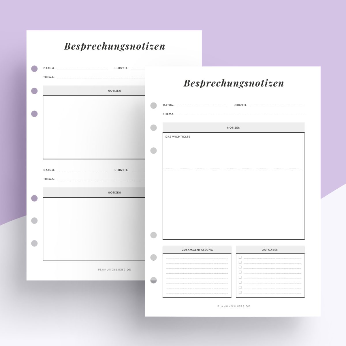 Die Besprechungsnotizen – Ringplaner Einlagen sind das perfekte Werkzeug, um deine Meetings effizient zu organisieren. Mit klar strukturierten Bereichen für Datum, Uhrzeit, Thema und Notizen behältst du den Überblick und kannst alle wichtigen Informationen schnell festhalten.