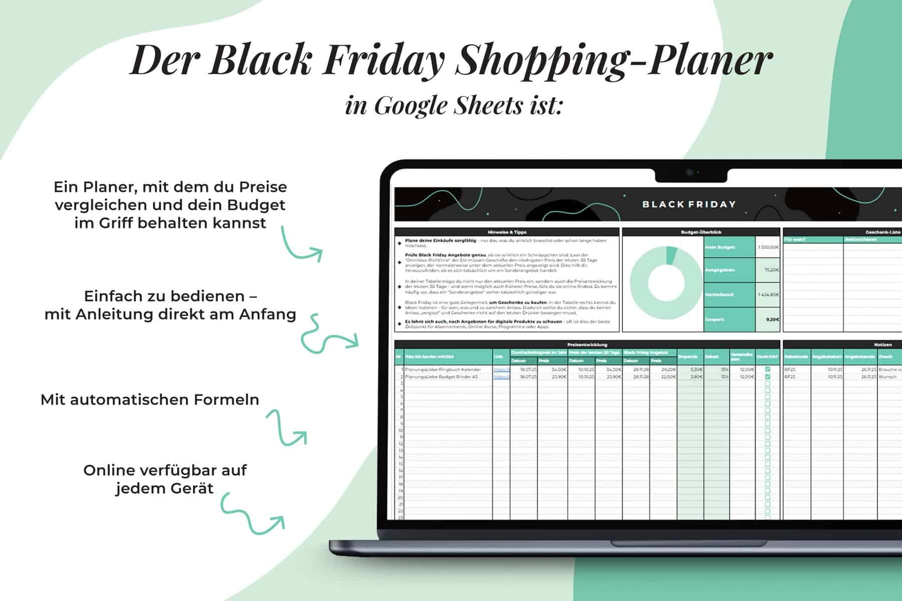 Zeit, Black Friday zu organisieren und nichts zu verpassen! Unser Google Sheets Planer hilft dir, Preise zu vergleichen, dein Budget zu kontrollieren und alle Angebote zu überwachen – alles an einem Ort!