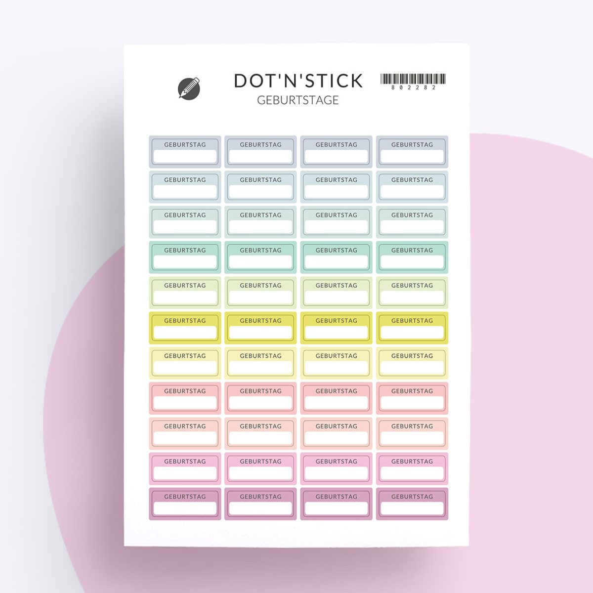 Mit diesen praktischen Stickern hast du alle wichtigen Geburtstage auf einen Blick in deinem Planer oder Kalender. Die Aufkleber sind in sanften Pastellfarben gestaltet und bringen nicht nur Ordnung, sondern auch einen Hauch Farbe in deine Planung.