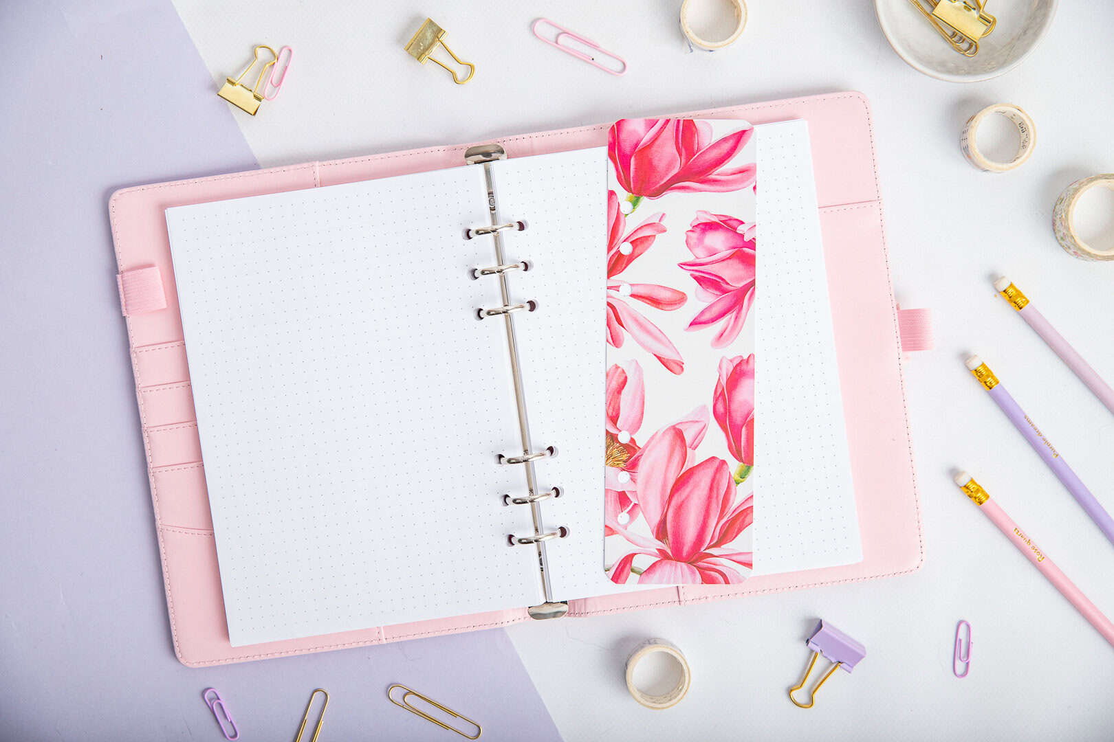 Mit unserem Lesezeichen für Ringbuchplaner findest du deine gesuchte Seite im Handumdrehen. Du kannst zwischen acht stilvollen Designs wählen: Paradiesischer Garten, Ätherisches Violett, Spätsommerträume, Magnolienblüte, Pink Love, Gänse, Forest Echo und Violette Galaxie. Finde dein perfektes Lesezeichen und verabschiede dich vom lästigen Blättern!