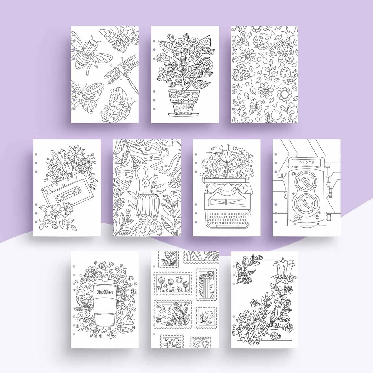 Zwischen botanischen Mustern, nostalgischen Szenen und Alltagsmomenten findest du Raum für dich selbst – zum Ausmalen, Träumen oder einfach Loslassen. Die Einlagen passen perfekt in deinen A5-Ringplaner und lassen sich ganz leicht integrieren. So hast du sie immer dabei, wenn du eine kreative Pause brauchst.