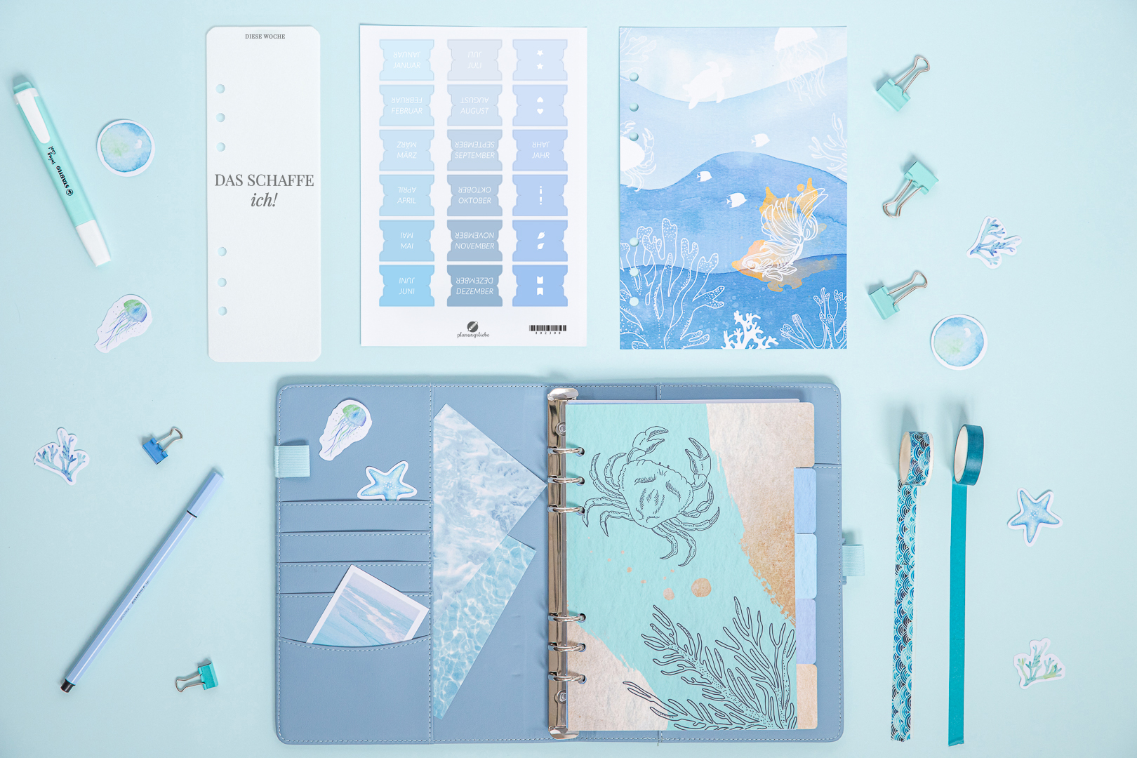 Im Set enthalten sind Register, Monatssticker und ein langes, transparentes Lesezeichen. Dieser harmonische Set hilft dir, deine Planung zu optimieren, Sektionen zu ordnen und alles griffbereit zu haben – an einem Ort.