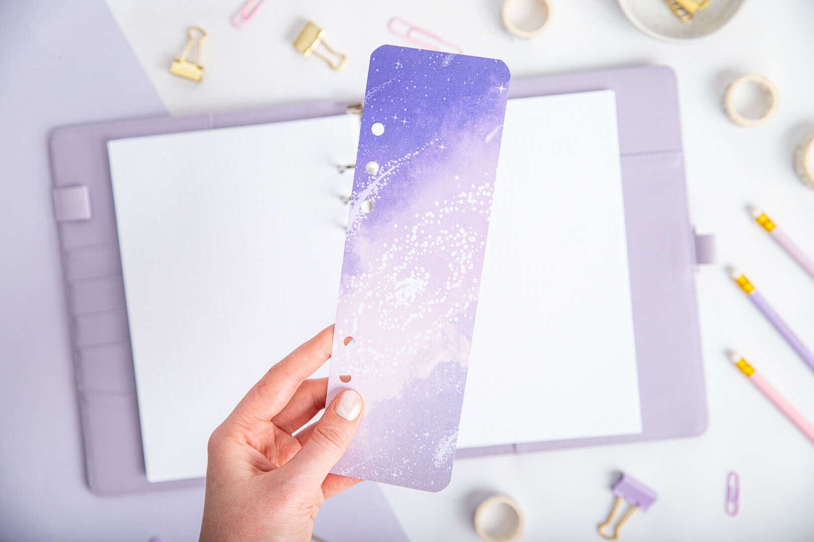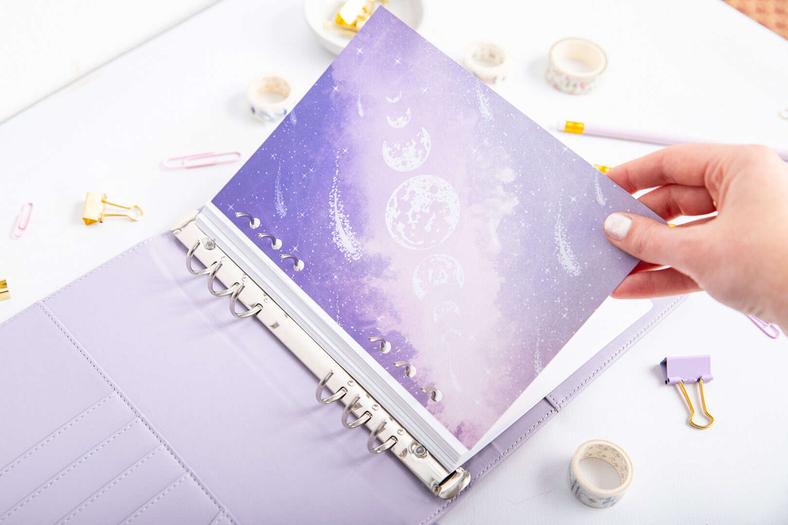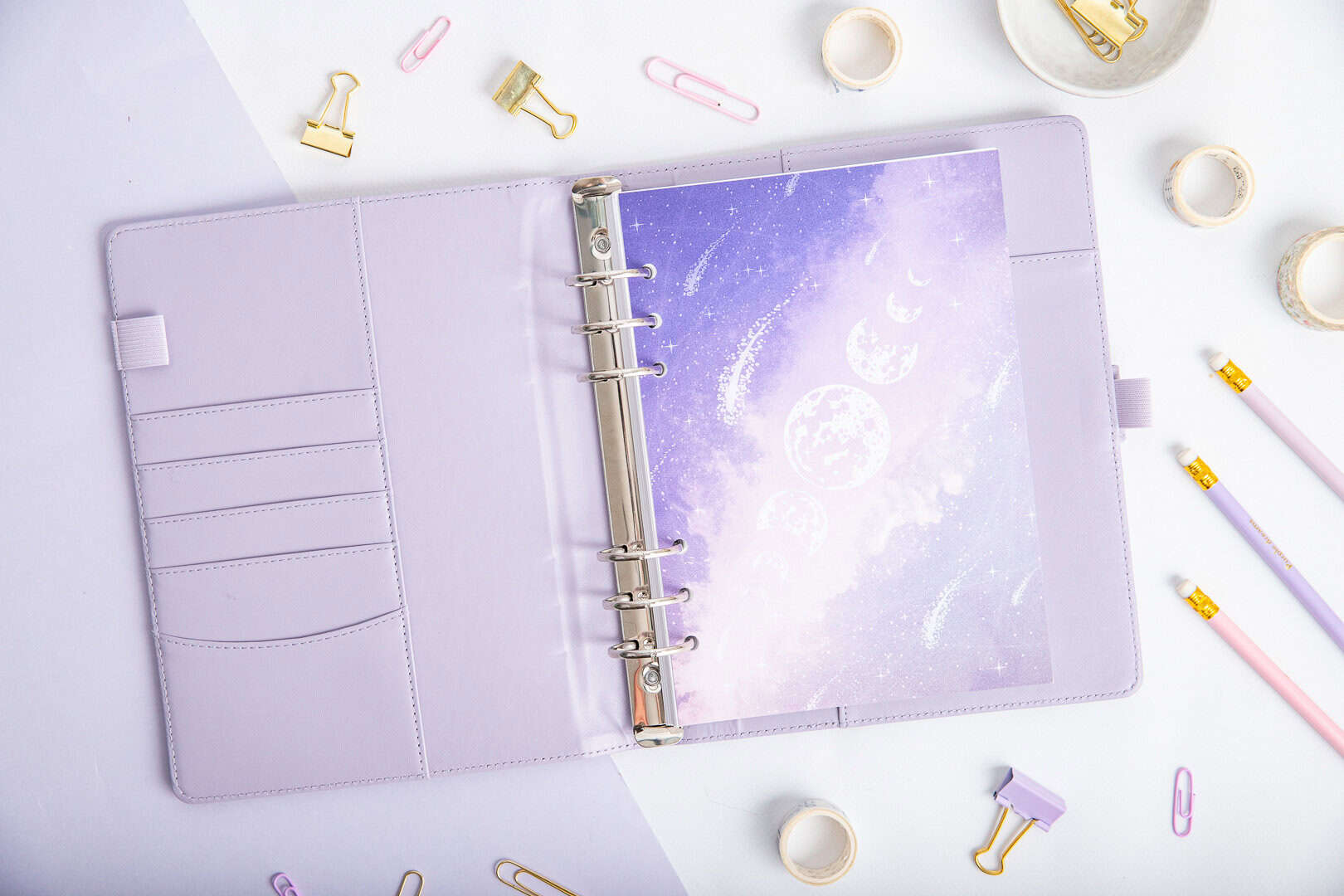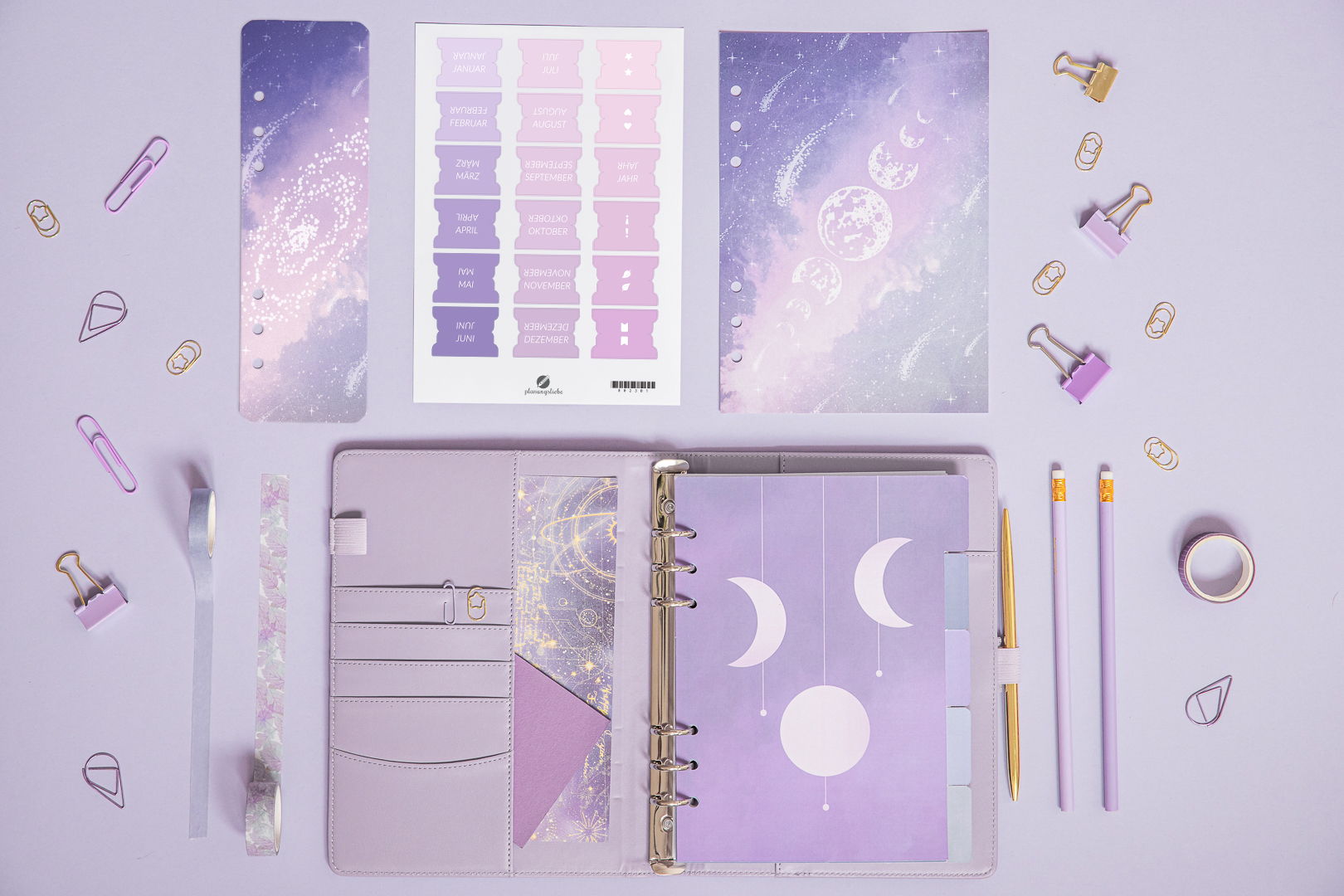Im Set enthalten sind Register mit dem Design „Mondschein“, lilafarbene Monatssticker, eine lange Lesezeichen-Registerkarte sowie die Titelseite „Violette Galaxie“. Der durchdachte Aufbau und perfekt abgestimmte Details helfen dir, deine Planung zu optimieren, Notizen zu ordnen und alle Sektionen genau dort zu haben, wo du sie brauchst.