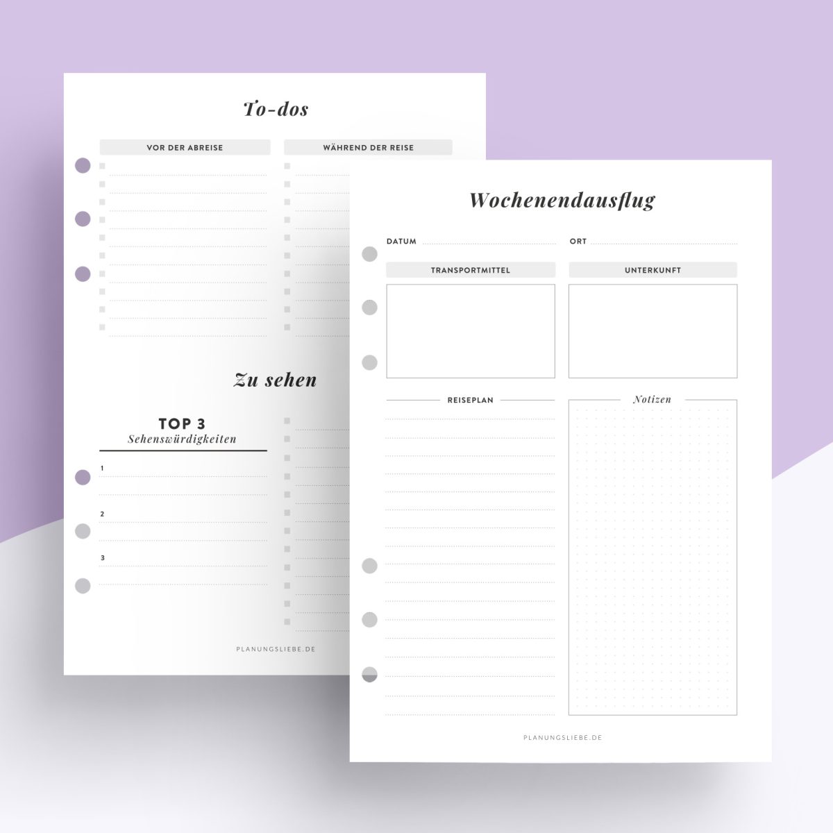 • Wochenendausflug: Hier kannst du deinen Reiseplan mit den wichtigsten Details wie Transportmittel, Unterkunft, Reiseplan und Notizen festhalten.