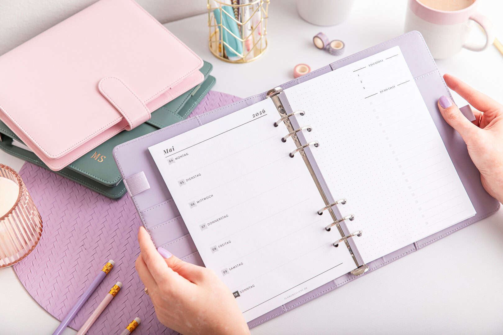 Das Produkt enthält einen A5-Ordner mit einem 6-Ring-System, einen Kalendereinsatz für 2026 und einen Skin Care-Einsatz.