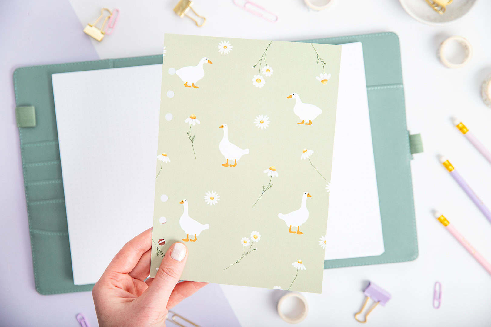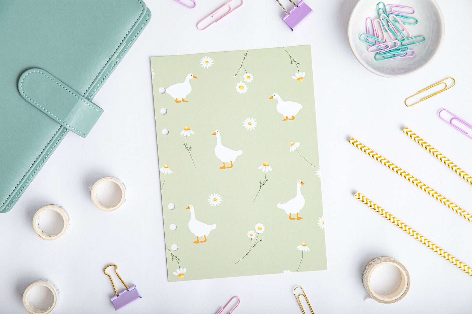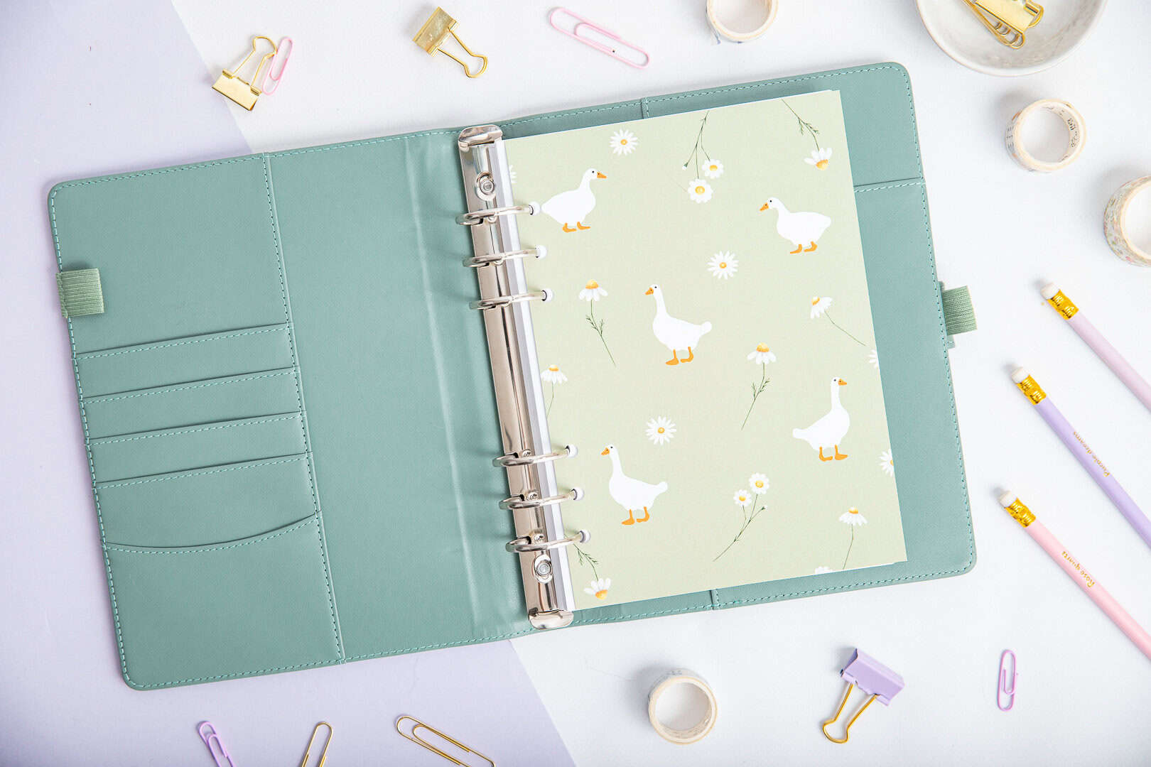 Das zarte Design mit fröhlichen Gänsen und Blumen dient als Separator, der die Sektionen des Organizers trennt und ihm gleichzeitig einen besonderen Charakter verleiht. Diese praktische Titelseite sorgt dafür, dass du deine Sektionen schnell findest, während sie deinem Organizer einen ästhetischen Akzent verleiht, der das Planen zu einem angenehmen Erlebnis macht.