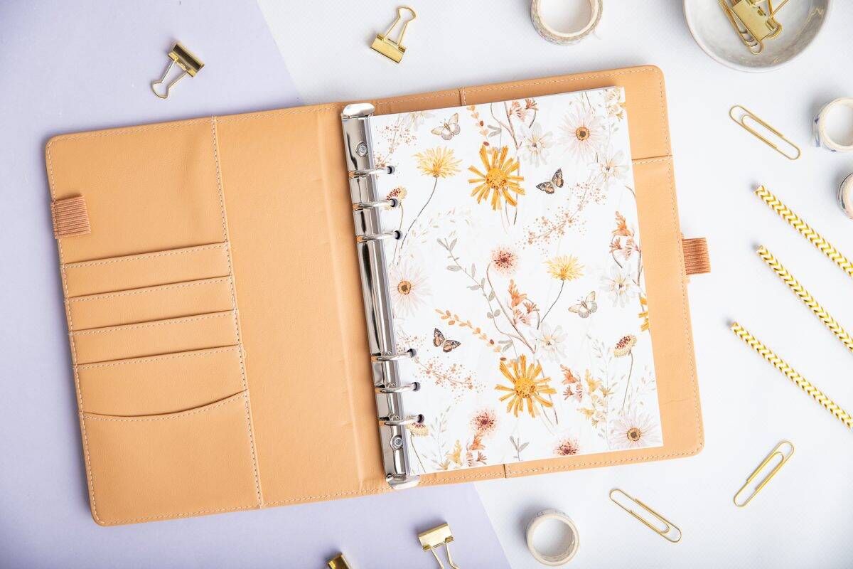 Die Titelseite „Spätsommerträume“ für deinen Ringbuchplaner ist ein zarter Akzent, der Harmonie und Ordnung in deinen Organizer bringt.