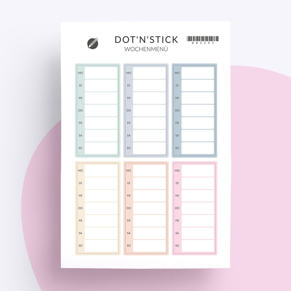 Mit den „Wochenmenü“-Stickern hast du deine Essensplanung für die ganze Woche im Blick. Jeder Sticker listet die Wochentage von Montag bis Sonntag auf und bietet Platz, um deine Mahlzeiten einzutragen – ob Frühstück, Mittag- oder Abendessen.